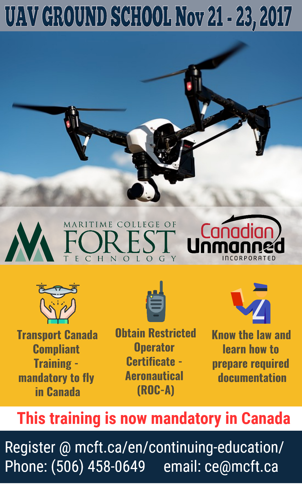 The Maritime College of Forest Technology’s Department of Continuing Education, in partnership with Canadian Unmanned Incorporated, is pleased to offer Unmanned Aircraft Systems Training (UAS)Ground School with Sterling Cripps as your facilitator.